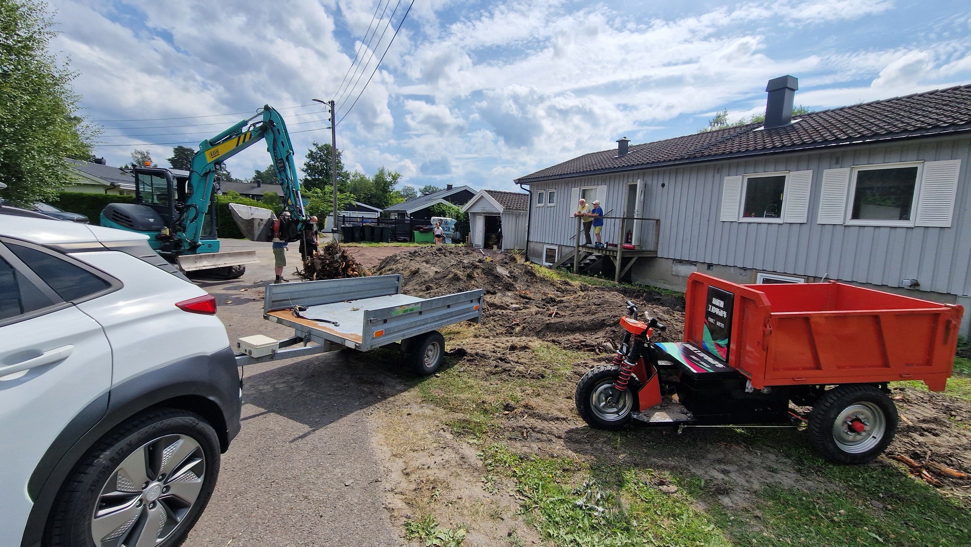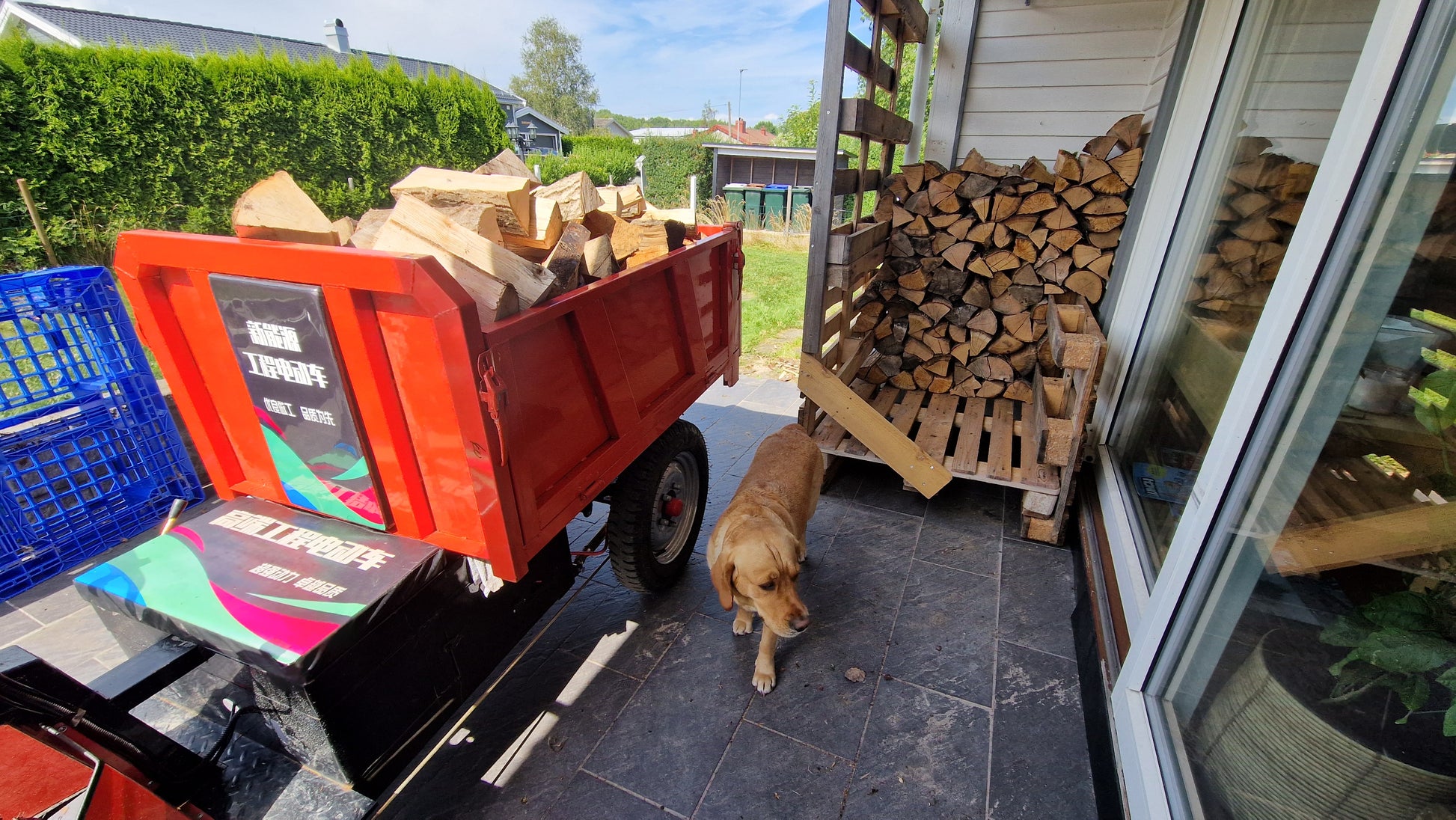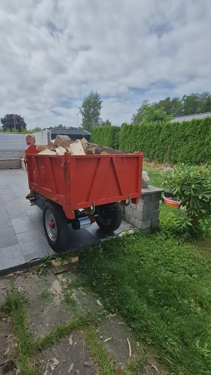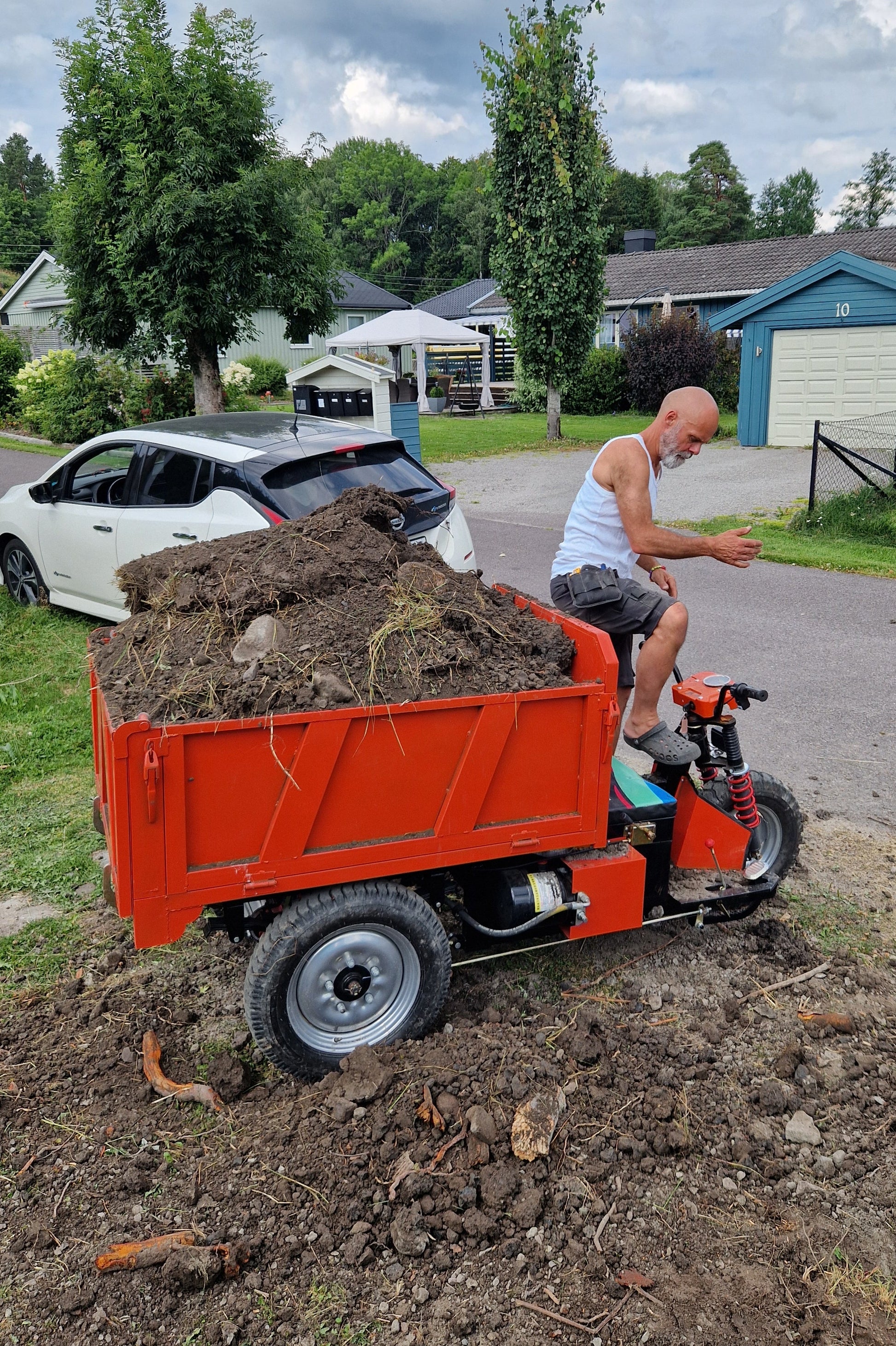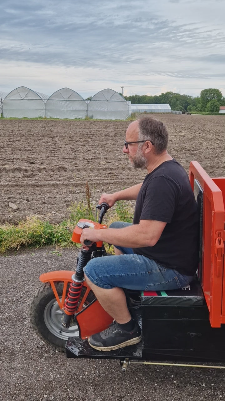 Kjempemorsom og praktisk elektrisk 3-hjuls traktor med hydraulisk tipp.